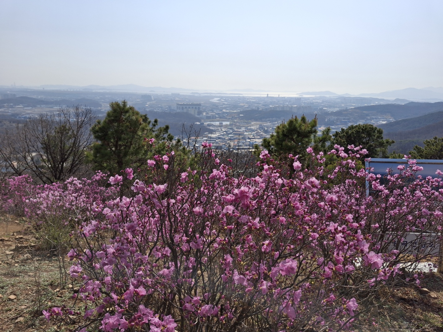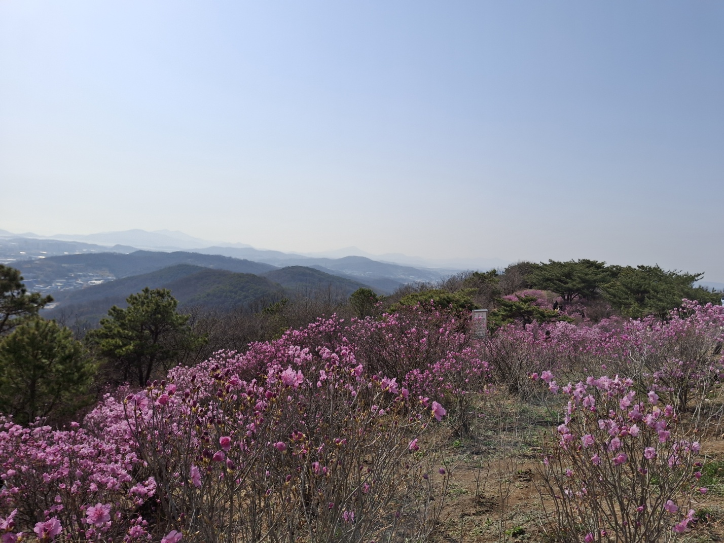 정상에 가까워질수록 진달래는 점점 더 활짝 피어 있었고, 햇볕이 잘 드는 곳에서는 이미 만개한 꽃들이 봄의 정취를 물씬 풍기고 있었습니다.