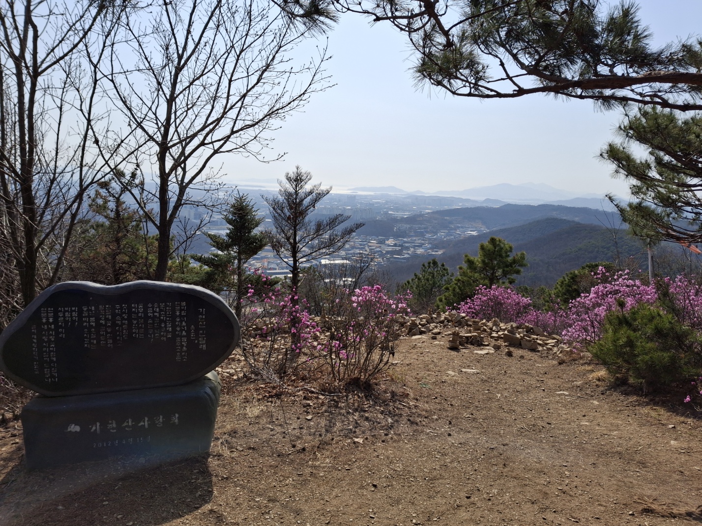 해발 215m 정상에는 정상 표지석과 수애단이 마련되어 있으며, 정월 초하루 해맞이 행사, 신년 기원제, 춘분 풍년 기원제 등의 지역 행사가 이곳에서 개최됩니다. 가현산은 고려 시대에는 상두산, 이후 갈현산으로 불리다, 지금의 가현산이라는 이름으로 바뀌었다고 전해집니다. 낙조와 황포돛대, 그리고 거문고의 전설이 담긴 이름이 참 정겹습니다.