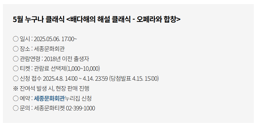 | ☎ 문의 | 세종문화티켓 02-399-1000 |