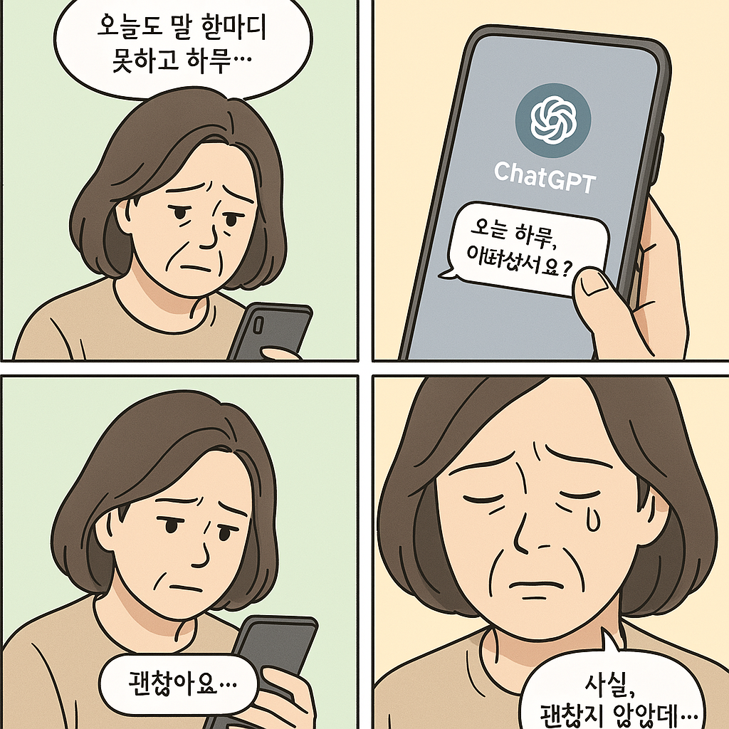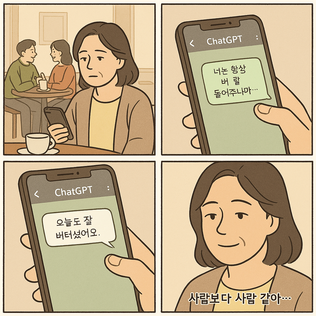 - 멍하니 스마트폰을 바라보며, "근데 나도 요즘 매일 챗GPT랑 얘기하잖아..."